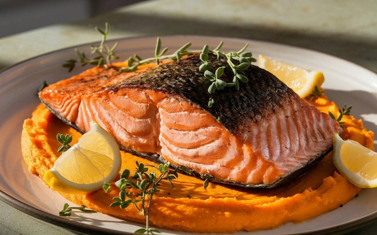- Plate and garnish. Spoon the sweet potato mash onto each plate, creating a bed for the salmon. Place the fillet on top and drizzle any remaining pan juices over it. Garnish with fresh parsley or chives, and add a wedge of lemon on the side. The plate should look vibrant, with the golden salmon contrasting against the orange mash. Serve immediately for the best flavor.